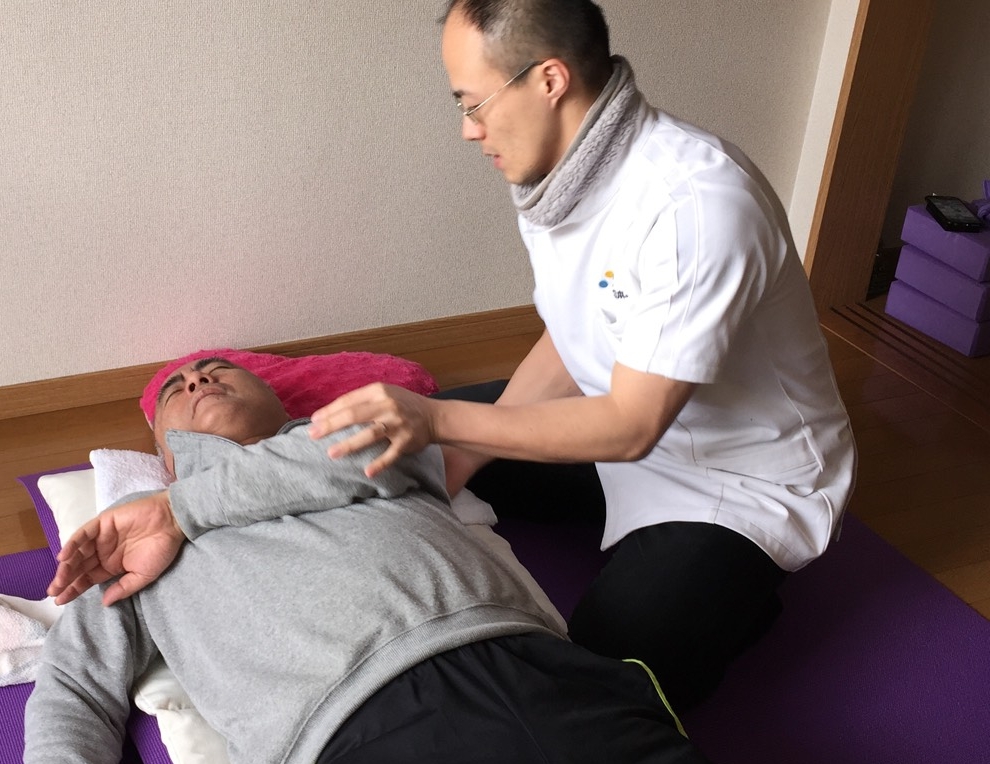 駅前のホテルの一室にて夜間、午前の施術会を開きました。